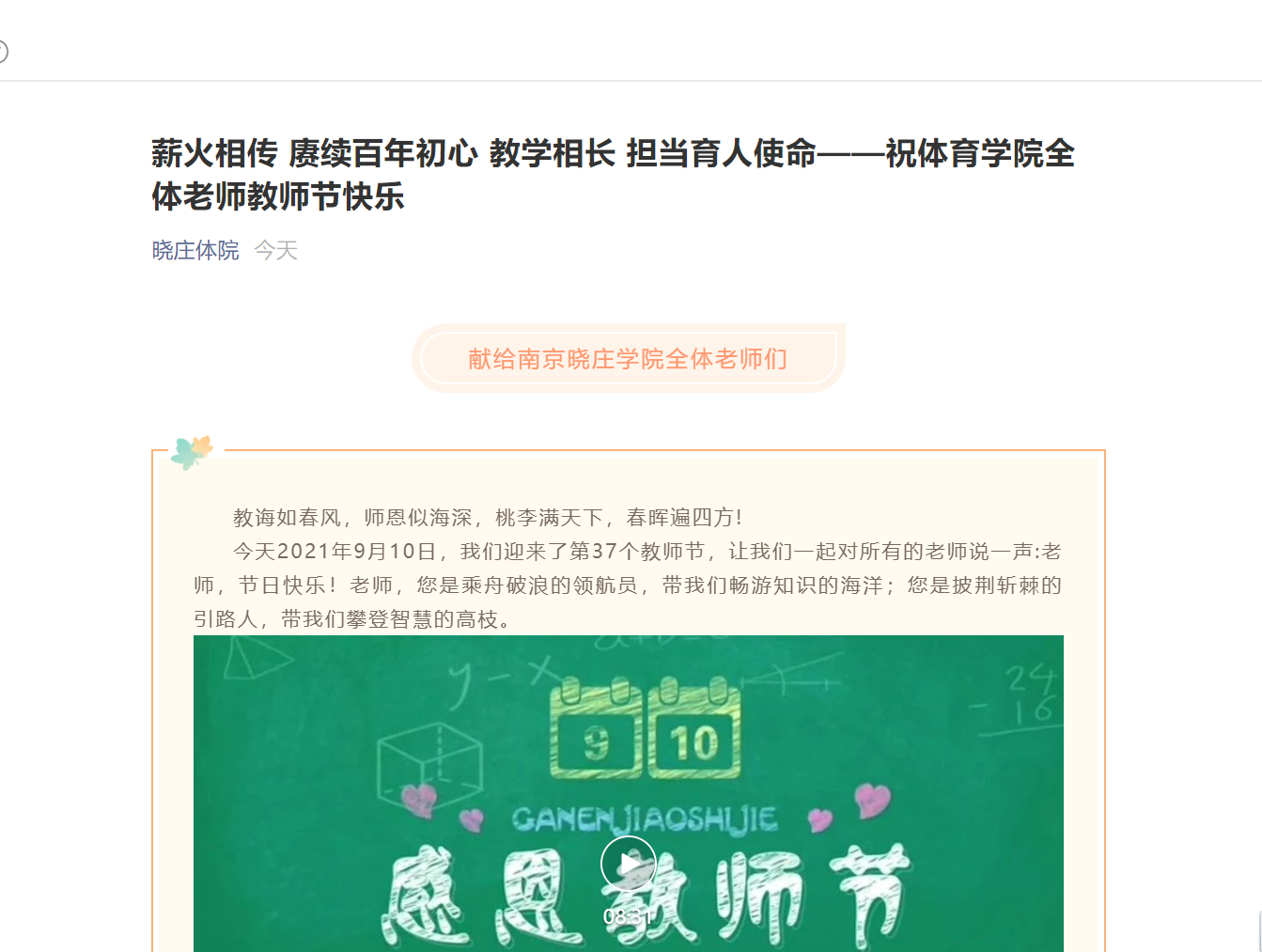 体育学院教师节活动以“薪火相传 赓续百年初心 教学相长 担当育人使命”为主题开展了系列活动,主要有体育学院多名杰出校友自发录制节日祝福视频,分工会制作汇编,在教师节当日通过官微推送给每位教师,祝教师节快乐!体育学院院长代表党政班子通过学院官微表达了对全院老师的慰问并送上节日的祝福。学院学生会组织留校师范生与在校教师进行了一场体育传承的交流赛,薪火相传,教学相长,现在与未来的教师切磋球技,交流教法,一片欢声笑语!