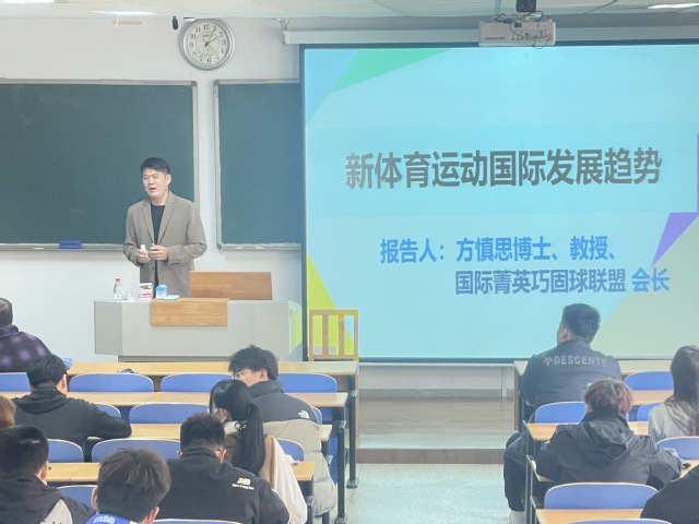 2023年3月7日下午,我院邀请台湾体育大学方慎思教授为学生做《新体育运动国际发展趋势》的学术报告。方教授从新体育的定义,时代潮流下新体育的崛起,新体育产生的原因,新体育项目的发展背景等多个角度详细阐述了新体育的发展历程,分析了新体育项目的国际推广问题,总结了新体育国际推广中存在的困难等现状,进而提出了对于新体育推广的策略。